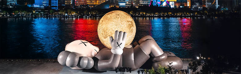 Інсталяції KAWS завжди об’єднують публіку з різних країн. Його культовий персонаж Companion — це символ саморефлексії, емоцій та сучасної самотності. У проєкті HOLIDAY Abu Dhabi він представлений у гігантських масштабах: фігура лежить на спині, притискаючи до себе сяючу сферу, що нагадує місяць.