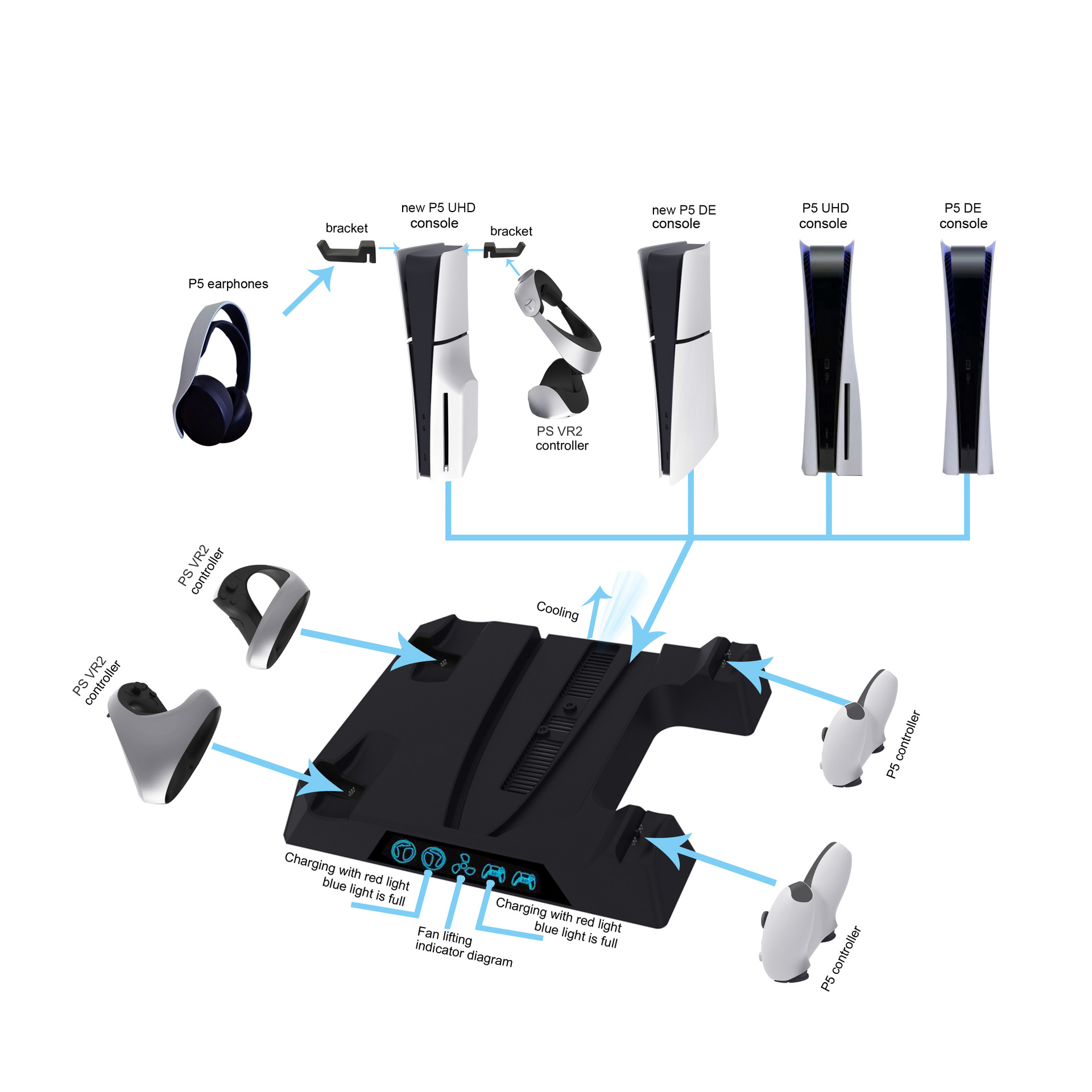 1. Розроблено спеціально для розсіювання тепла нових консолей P5 UHD/DE&P5 UHD/DE, зарядки контролерів p5 і контролерів PSVR2