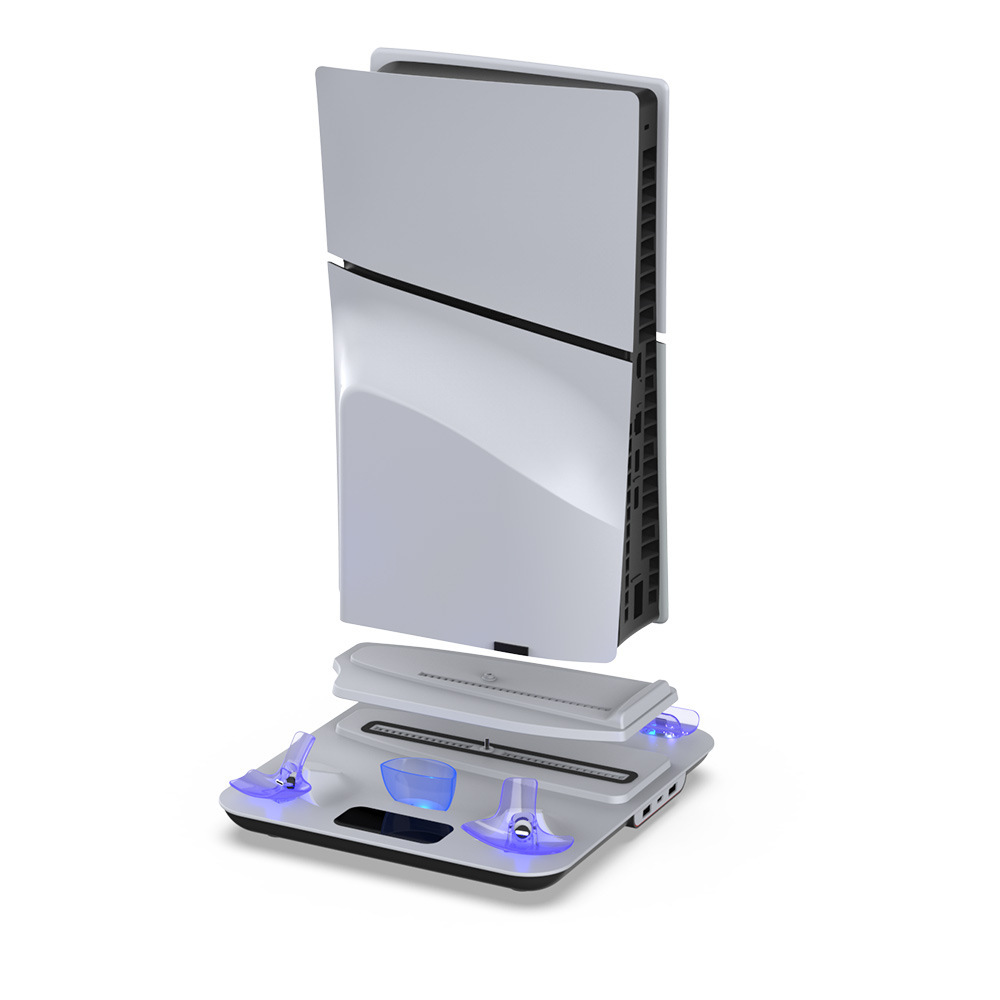 Цей продукт є універсальною багатофункціональною охолоджувальною базою для консолей PS5slim/PS5. Він інтегрує охолодження консолі PS5, зарядку контролера PS5, зарядку контролера PS VR2 та інші функції. Цей продукт має вбудований високоточний мікропроцесор, подвійне незалежне підвищення напруги джерела живлення та точну схему керування захистом від перевантаження по струму. Він підтримує одночасне заряджання двох контролерів PS5 і контролерів PS VR2, а статус незалежного заряджання вказується різними індикаторами. База оснащена подвійними вентиляторами охолодження, які дозволяють регулювати три швидкості вентилятора вручну та функцію пам’яті при вимкненні. Для підключення до консолі PS5 для живлення використовуються подвійні зарядні кабелі USB – TYPE-C, а також є порт виведення даних USB 2.0 і вихідний порт USB для зарядки. Завдяки інноваційному зовнішньому вигляду, потужним функціям і зручному управлінню цей пристрій є улюбленим пристроєм для геймерів PS5
