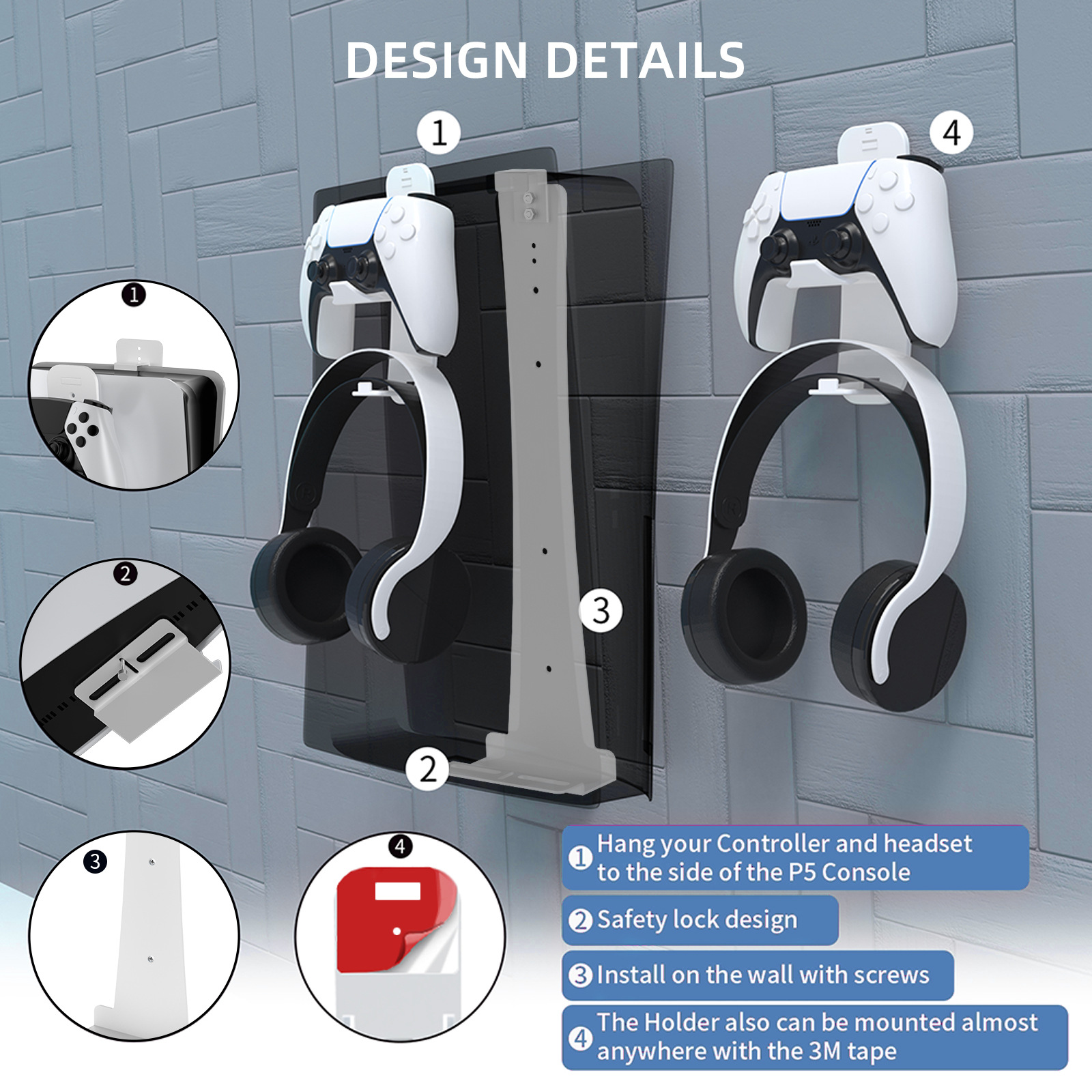 Разом із основним кронштейном ви отримуєте універсальні гачки для аксесуарів. Вони дозволяють зручно розмістити геймпади, навушники, зарядні кабелі та інші дрібні пристрої. Завдяки змінному дизайну верхній гачок можна або прикріпити до самої консолі, або зафіксувати на стіні, що дає більше свободи у виборі варіантів розміщення. Передбачені монтажні отвори, які спрощують кріплення, а також можливість використовувати клейку стрічку для фіксації на гладких поверхнях.