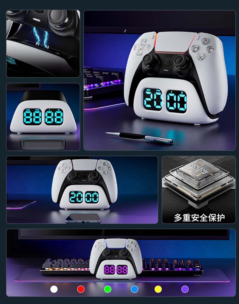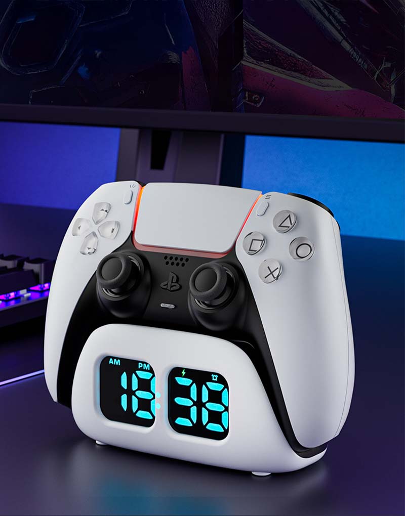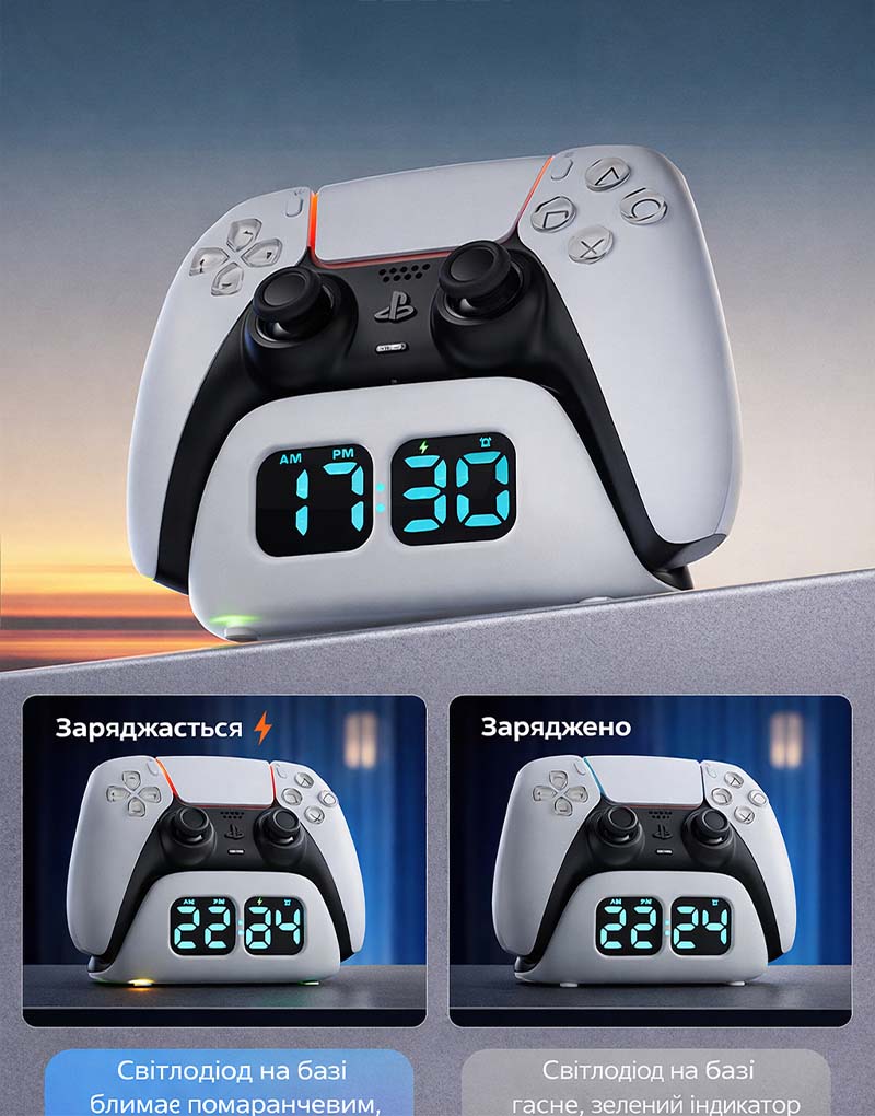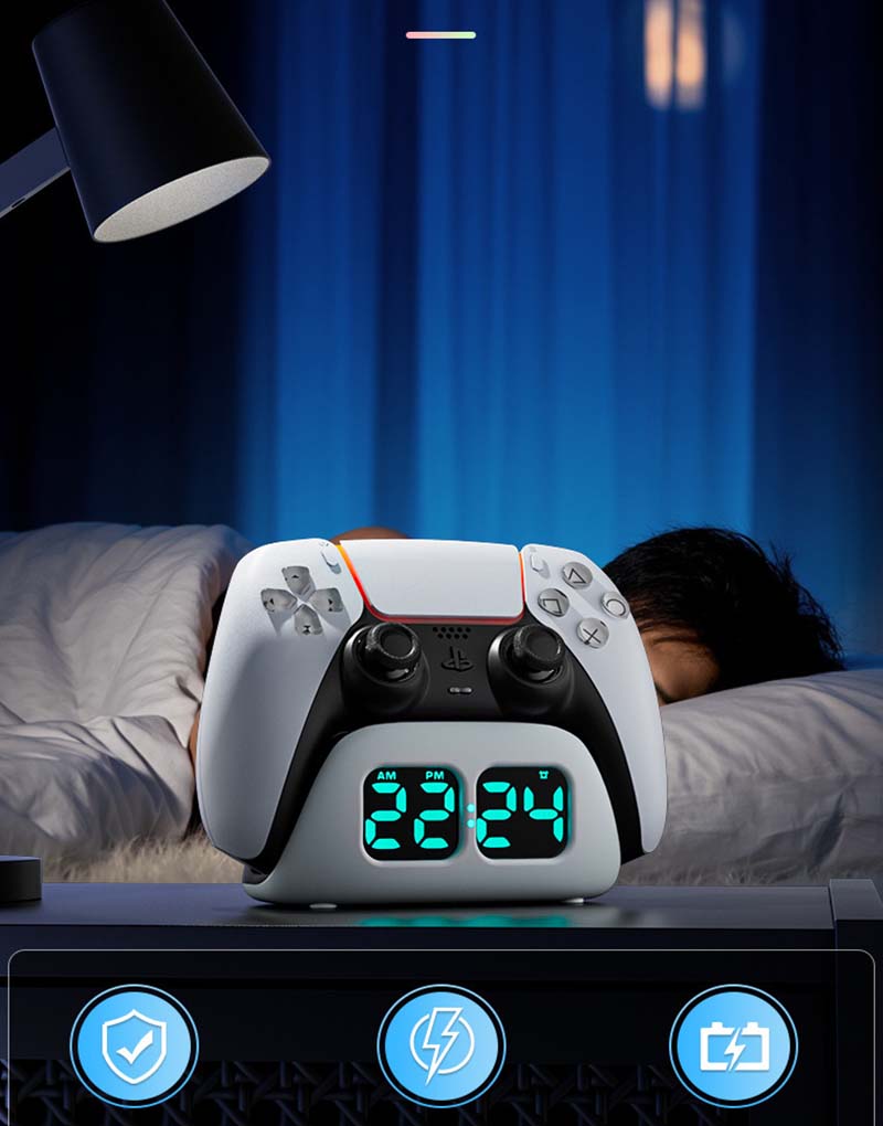 Багатофункціональна зарядна станція Aolion AL-P5468 створена спеціально для безпечної та швидкої зарядки одного контролера PlayStation 5 DualSense. Вона поєднує в собі зарядний док, настільний цифровий годинник і будильник, роблячи ігрове місце більш зручним, організованим та стильним.Станція підтримує контактний спосіб зарядки — достатньо просто встановити геймпад на підставку, і заряджання почнеться автоматично. Це зручно для щоденного використання та допомагає уникнути зношування кабелю. Завдяки інтелектуальній системі керування живленням пристрій забезпечує стабільну подачу струму та автоматично припиняє зарядку після повного заповнення акумулятора геймпада.