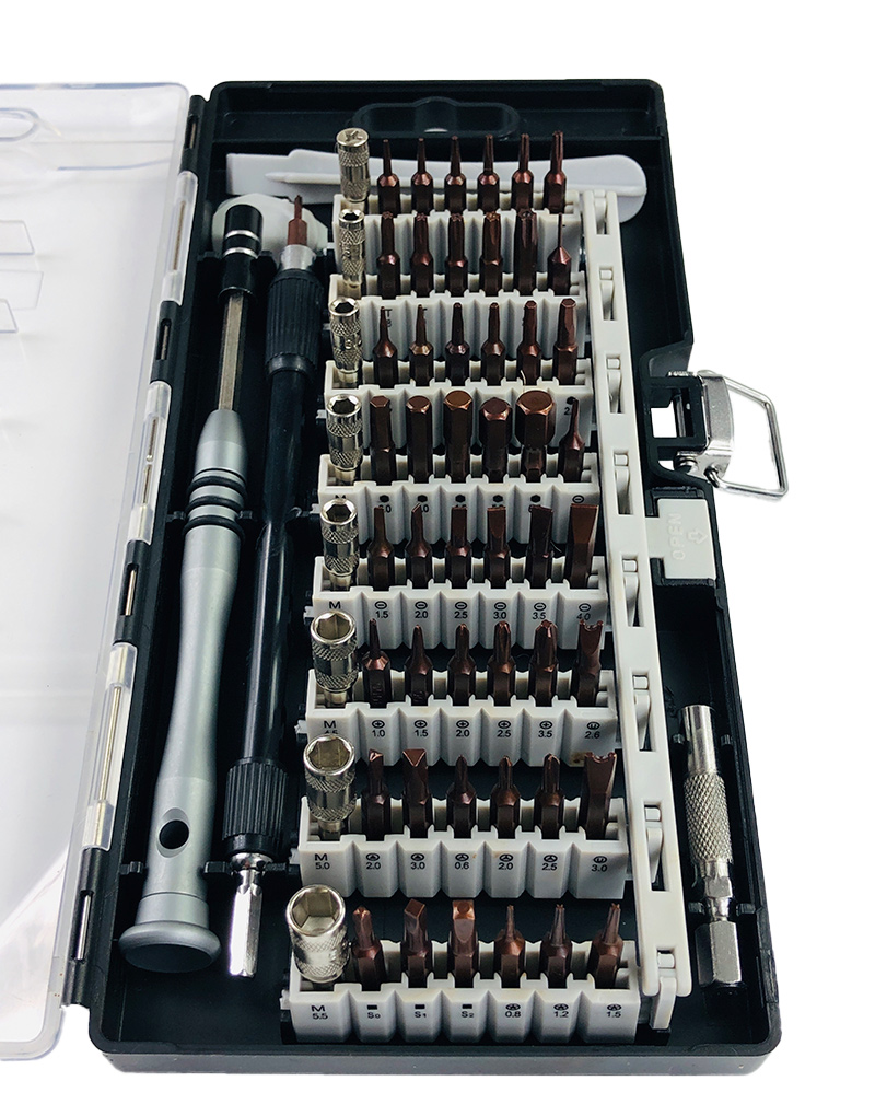 Набір включає в себе широкий асортимент викруток з різноманітними бітами та насадками. Це дозволяє легко і швидко розібрати будь-яку техніку, незалежно від її моделі чи типу поломки.